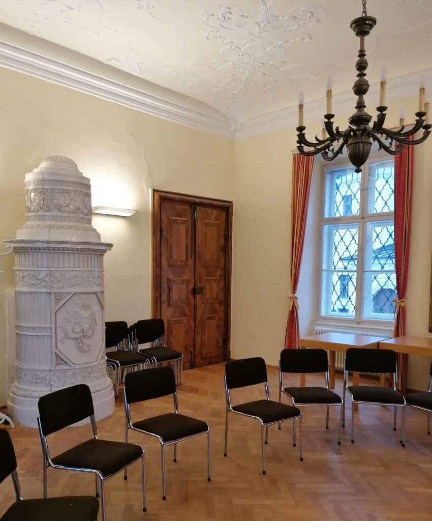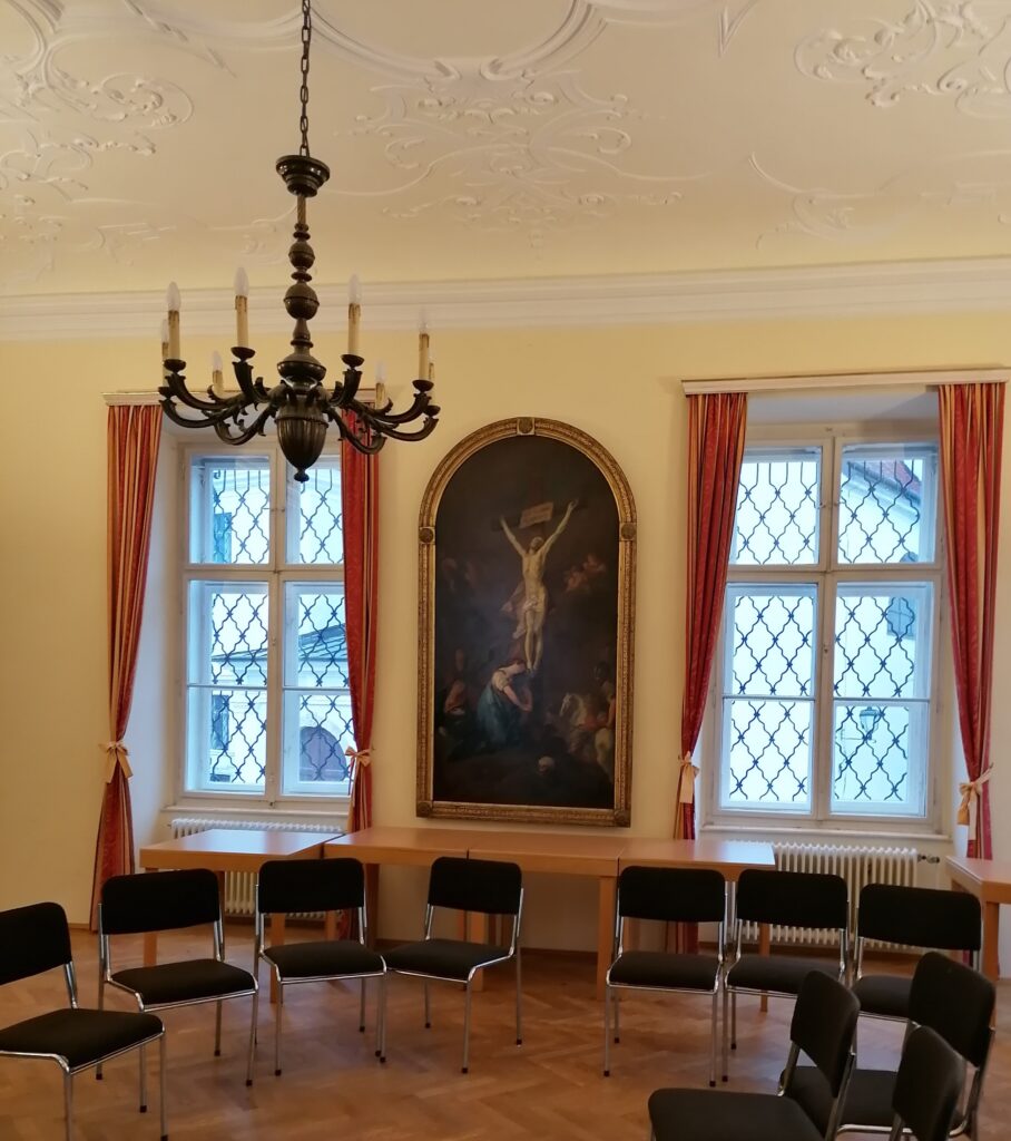 Im ersten Stock des Pfarrheims befindet sich der Meditationssaal. Der Raum zeigt typische Elemente barocker Innenarchitektur. Besonders hervor sticht die kunstvoll gestaltete Stuckdecke mit ihren plastischen Ornamenten. Ein zentrales Ausstellungsstück des Meditationsraums ist ein Gemälde welches sich in einem aufwändig verzierten und vergoldeten Rahmen befindet. Ein kunstvoll gestalteter weißer Kachelofen mit Reliefs und geschwungenen Formen bildet ein weiteres charakteristisches Ausstattungselement.